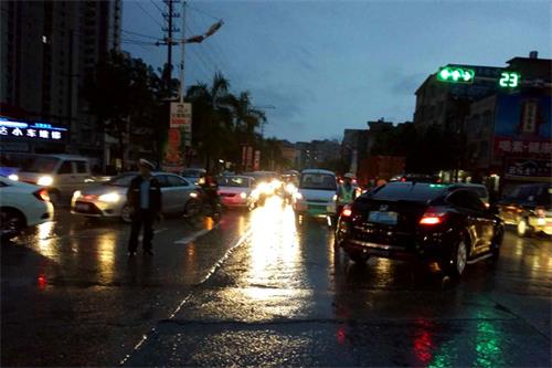 9月11日傍晚,岑溪市遭遇强降雨,当时恰逢周末学生返校高峰,车流量井喷式增大,强降雨又导致了部分道路出现内涝,加大了群众出行和学生返校的难度。为了保障学生返校和群众出行的安全,岑溪“小黄衣”风雨中坚守岗位,执勤民警在各大主干道路及学校附近交通拥堵路段疏导交通,指挥车辆有序通行、停放,确保学生及时返校。