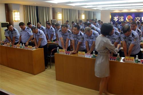 当天晚上19时许,宣教员潘耀明老师以简洁明了的语言介绍了急救的原则、目的、步骤等方面的理论知识,分析在发生突发事件或自然灾害时,面对伤病人员的应急处理知识,如对伤病人员生命意识判断,发生休克、晕倒、溺水、窒息等情况的应急处理,争取伤病人员的黄金抢救时间,避免因错误救助举动给伤员造成更大的伤害,还生动风趣地用救护成功的实例说明加深印象。为了更好的掌握救护技能,潘耀明逐一讲解CPR现场紧急救护知识和具体实施步骤,如心肺复苏、胸外按压、开放气道、人工呼吸等救护工作,并让民警、协警现场模拟练习操作技巧。同时,由于工作需要,民警、协警通常需要在炎炎夏日顶着烈阳工作,潘耀明强调高温中暑危害和救护技巧,加强众人的自救意识。