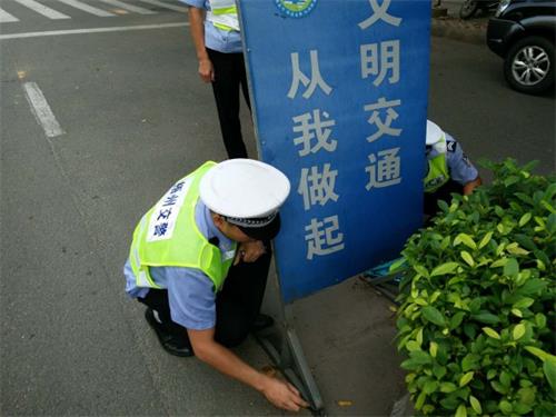 为全面加强辖区道路交通安全管理工作,构建和谐交通秩序,有效预防和减少城区道路交通事故的发生,长洲交警在辖区各主干道边上放置了多块交通安全提示牌,提醒驾驶员文明驾驶、平安出行。在经过数月的日晒雨淋后,一些提示牌出现了褪色、模糊、边缘翘起等情况,严重影响了市容市貌,人民群众的工作和生活带来不便。为了能以一个整洁的环境迎接国庆长假的到来,9月22日,长洲交警对辖区主干道边上的交通提示牌进行了统一的更换。