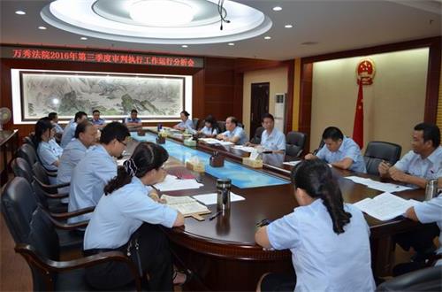 10月14日,万秀区人民法院组织中层以上负责人召开2016年第三季度审判执行工作运行分析会,通报1-9月审判质效主要指标完成情况,分析当前审判执行工作形势,安排部署第四季度审判执行工作。