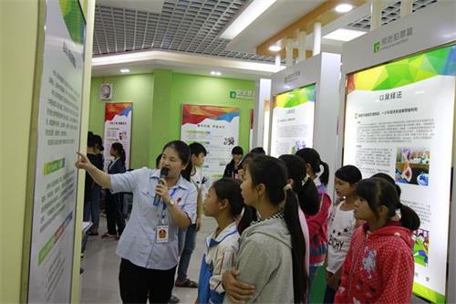 同学们认真听法官姐姐讲解法治教育展板区的法律知识