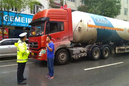 当天下午,广西岑溪市公安局交通管理大队城区中队民警在市区龙井大转盘路段开展日常路面查检。16时许,一辆十几米长的危化品大型运输车从市区往探花方向行驶,在行经龙井大转盘时被检查点的执勤民警拦截下来。这辆运载量达20吨重的天然气运输车,一旦发生意外后果不堪设想,尤其在人员密集的闹市中,安全隐患更成倍数增加,按照相关规定危化品运输车是不允许驶进市区的。
