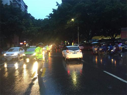 11月10日下午17时起,雨势渐渐变大,大队执勤人员上路,采取固定执勤和巡逻相结合的方式,加大路面巡查力度,在重点时段、重点路段增派警力和警车,提高见警率和管事率,执勤人员化身“小黄人”顶着寒风冷雨站在各大路口处对过往车辆进行分流和疏导,全面确保辖区路面秩序不失控,确保下班放学高峰期时段和主要交通路口不发生交通拥堵事件。