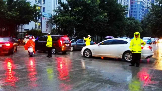 在菊湖路口,执勤民警与协警三人一组,相互配合,共同协作,用响亮的哨声和标准的指挥手势耐心的疏导,来自不同方向的机动车有序通过路口。此外,协警还主动提醒过往车辆和行人注意减速慢行、安全行驶。雨不停地下,民警与协警不停地忙碌和疏导,冰凉的雨水打湿了他们的衣衫,浸湿了他们鞋子,就连眼睛也被这绵绵细雨迷糊,,非常寒冷,但为了保障市民能尽快回到温暖的家中,大家都忘记了浑身的疲惫,继续坚守岗位,全力以赴疏导交通。夜幕低下,华灯初上,路上的行人与车辆渐渐少了,但长洲大队的执勤民警与协警始终坚守,直到晚上19时40分,在确认辖区各主干道交通畅通无阻后,民警和协警才慢慢走下指挥岗点,吃上这迟来的晚餐。