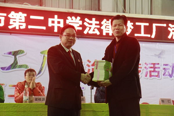 活动以赠书仪式开场。岑溪法院向岑溪二中“书香校园”建设捐赠了百余本法律书籍,表达了法院干警对莘莘学子的关切之情。随后,在领誓学生代表的带领下,全场师生起立,面对国旗,进行了庄重的守法宣誓。