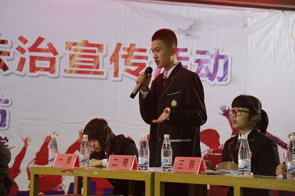 岑溪二中的学生还围绕“中学生日常行为靠自律还是他律”开展一场法律知识的辩论赛。双方辩手们围绕校园生活,用富有生活气息、机智风趣的语言展开激烈辩论,引发了全场的热烈反响。