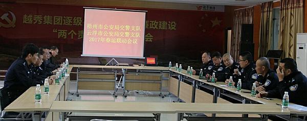 为进一步加强省际区域警务协作,提前做好2017年春运准备工作,确保春运期间相邻省份交通管理部门之间沟通顺畅、协作高效,预防和缓解苍郁高速云梧段、岑罗高速云梧段的管控压力,做好春运大流量期间疏堵保畅与应急处置工作,强化春运省际交通安全执法服务站联勤合作,保障人民群众的生命财产安全,于12月22日,梧州、云浮高速交警支队代表在梧州市广西越秀苍郁高速公路有限公司召开2017年春运交管工作联动会议,梧州交警支队副支队长莫勇刚主持会议。