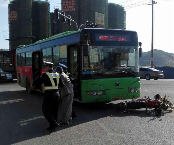 上午9时许,辖区城东五路发生一起摩托车与公交车轻微碰撞的交通事故。大队事故中队接到警情后迅速出警,达到现场后看到摩托车主倒在地上,但身上并未发现明显伤痕,经过执勤民警详细询问其伤情后,在其自己确认并无大碍的情况,民警将伤者扶至路面,等待医护人员的到来,同时启动事故快处机制,将车辆迅速移走,避免了事故造成的道路堵塞。