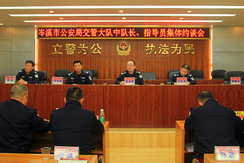 12月27日,岑溪市公安局交通管理大队召开纪律作风整顿集体约谈会,全体大队领导及各中队的中队长、指导员参加了约谈会,岑溪市公安局副政委、交管大队大队长盘涌辉主持约谈。