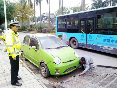 无独有偶,1月8日,长洲交警在竹湾路巡查时也发现了一辆已经停放了好一段时间的无主绿色小汽车。同样的,这辆小车的前后位置也没有悬挂车辆,由于长时间无人打理车辆已经积满了灰尘,发动机号码也已经模糊不清。由于无法及时找到车辆的驾驶人,长洲交警只能先将车辆拖移,以及时回复道路交通秩序,力保市容环境整洁。
