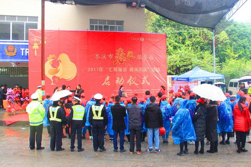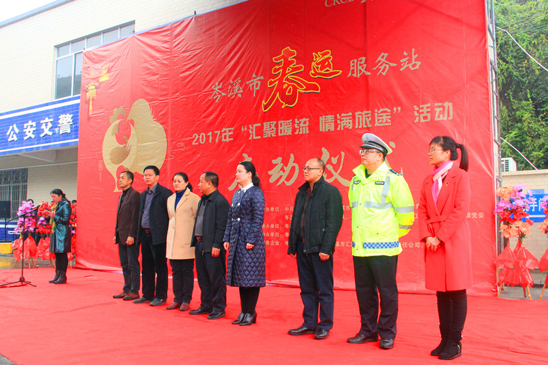 岑溪市市委副书记卢宽,市人大副主任、市总工会主席谢梅,副市长伍瑜以及市委组织部、精神文明办、公安局交管大队、教育局、总工会、市团委、筋竹镇等领导,和新闻媒体、爱心企业、青年志愿者们一起参与了2017年岑溪市春运服务站启动仪式。春运第一天,岑溪市“温暖回家路”春运服务站中更是低温寒潮飘加阴雨连绵,但这并不能阻止活动参与者们的满腔热情的服务暖流。