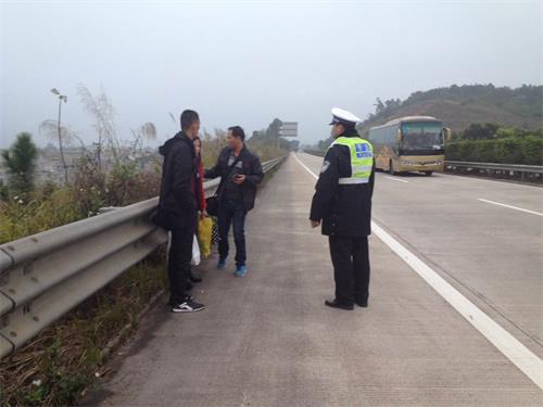 1月18日,大队民警按常加强辖区路面巡逻,消除路面道路交通安全隐患。17时40分许,大队民警巡逻至S50岑罗高速4公里处时发现有三人在路面观望,似乎在等车。民警随即下车询问情况,经陈述他们是从对向的岑溪东服务区穿过高速公路走到该处等侯乘搭一辆开往玉林方向的货车。“高速公路候车是十分危险的,且在高速上是禁止上下车……”大队民警对他们的行为进行了严厉的批评和教育,并责令他们上车,护送他们到岑溪东服务区(往玉林方向)候车。听了民警的批评教育,他们表示一定不会再做这种危险的事,并对民警热心送他们到服务区表示十分的感谢。
