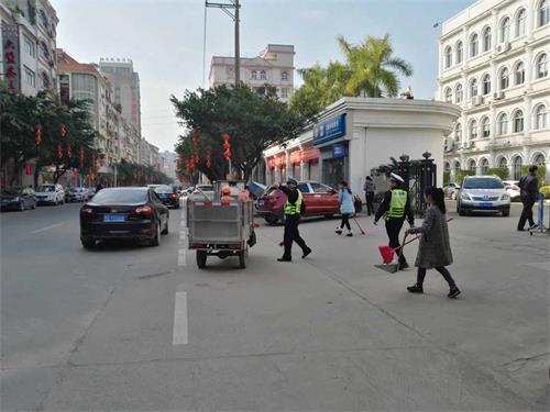 龙圩区交警大队全体民警、协警打扫城区各个主要街道