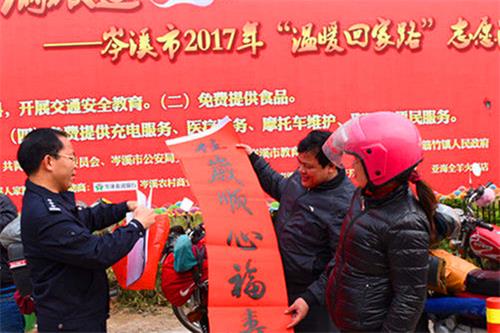 “老乡,您好!这是我们岑溪交管大队送给您祝福和春联,希望您注意安全驾驶,平平安安回家过年!祝您新春快乐!”岑溪市公安局政委黄云龙和岑溪书法协会中的民警及部分会员一道走到驾驶摩托车返乡的老乡中去向他们赠送春联和美好新春的祝福。