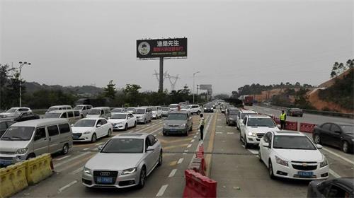 民警迅速排查堵点,发现主要由于车流量较大,桂东收费站收费通道少且收费缓慢所引致,大队领导及时向广西越秀苍郁高速公路有限公司负责人沟通协调,由之前的6条收费通道增设多6条收费通道加快收费速度。同时,大队还加强路面巡逻,保障应急车道的畅通,及时快速处理轻微交通事故等措施,杜绝因事故造成堵塞,并加强警力在收费站指挥车流有序经过收费站通道。此外,大队还利用电台、微博等媒体渠道发布路面即时信息和绕行信息,引导和分流车辆绕行国道,从而缓解交通缓慢行驶压力。截止当天晚上20时,缓慢通行车龙均安全、有序通过了桂东收费站驶入广东境内。