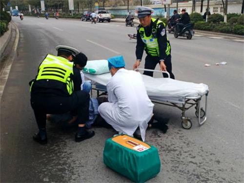 可能是事故当时受到了撞击,老人一时间无法坐起,只能双手捂头倒在地上,而一边的小汽车驾驶人手足无措焦急等待。看到这个情况,执勤民警第一时间拨打“120”前来救助,同时对通过该路段的其他机动车进行疏散,防止再次发生交通事故。几位协警立即在事故区域前后方位置处放置反光锥桶和警告标志,提醒其他车辆小心慢行。很快,“120”救护车赶到事故现场,执勤民警及协警又协助医护人员小心翼翼地将伤者转送至担架并送往市红会医院进行治疗。