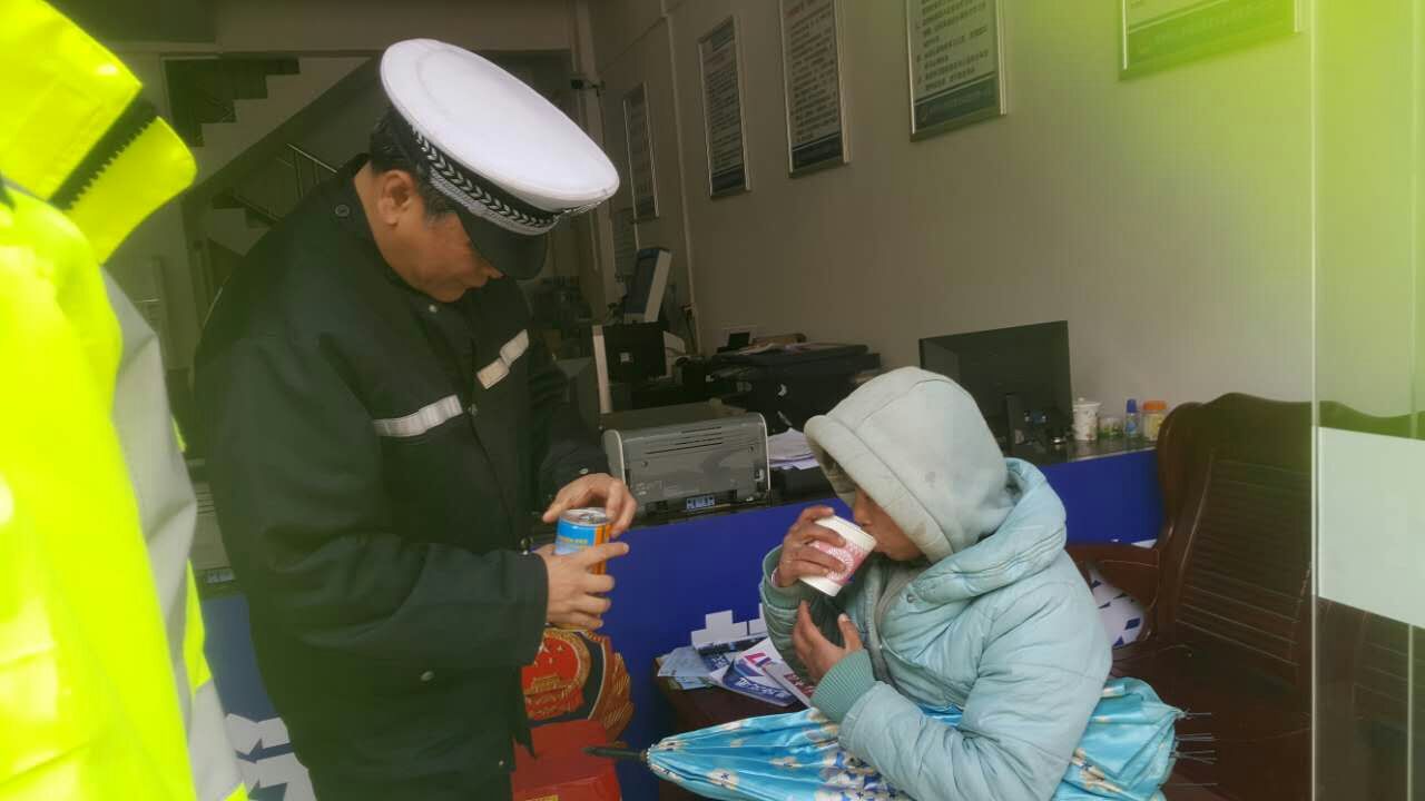 民警递上暖热了的八宝粥给女子驱寒充饥