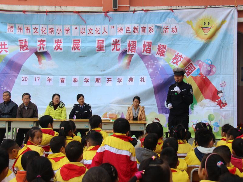 文化路小学上,宣传民警通过问答互动、讲解中穿插故事案例等学生爱听易接受的讲课方式,给大学生讲解了道路交通安全知识和日常参与交通的注意事项及预防措施,对同学们提出的问题一一进行了详细解答,为师生们送上精彩的交通安全知识培训课,使广大学生认识到学习交通安全知识的重要性,启发学生们遵守交规从我做起、从现在做起,提高交通安全防范意识。会后,组织家长们召开“家长督学暨2017年春季学期安全工作会议”,呼吁家长能以身作则遵守交通安全法律法规、树立文明礼让的美德,做孩子们文明出行的“好榜样”。
