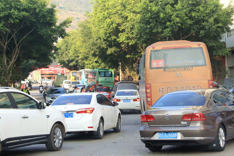 岑溪市地处两广交界,广昆高速、包茂高速、国道207线、324线在此交汇,是广西进入广东的主要交通枢纽,车辆、人口高度密集,每年春运岑溪交管部门都备受考验。年初六是春节假期的最后一天,不少务工人员开始井喷式往广东方向流动,外出探亲或游玩的家庭陆续返城,繁忙的交通线如同开了闸的江河,一批批返程车流的爆增令国道207线、324线以及岑溪东出口岑罗高速引线拥堵不堪,尤其义洲大道与岑溪东出口岑罗高速引线交汇处、义洲大道与北环大道交汇处堵车较为严重,直行和左转车辆互相阻碍,通行极为缓慢,造成长达1公里的候车“长龙”。