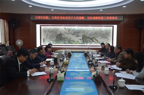 为推进诉讼服务中心第三方平台建设,2月28日,万秀区法院与万秀区司法局就人民调解、司法调解衔接工作进行座谈,万秀区法院党组书记、院长黎家伟,万秀区司法局局长魏钊生,万秀法院副院长黄秋红、诉讼服务中心主任梁木水及司法局有关干部参加了座谈。
