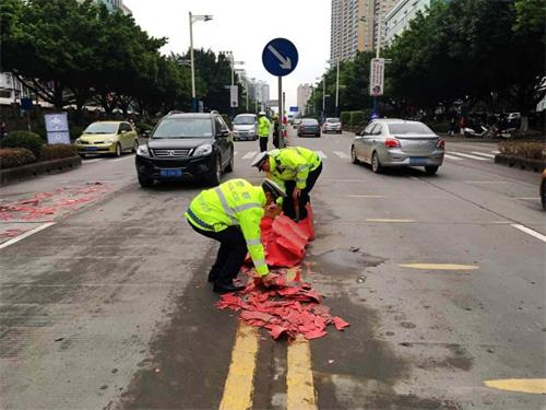 由于此次发现护栏受损的时间正值交通流早高峰期间,道路交通繁忙,为及时清理受损护栏,长洲交警大队迅速启动紧急预案,在受损护栏的前后方位置安排警力进行提前疏导,提醒驾驶人绕开受损护栏位置,防止二次事故的发生。为尽快恢复交通畅通,保障行驶安全为多位民警、协警马上在现场对护栏碎片进行清扫,将受损护栏转移至不影响交通的安全位置。经过了民警和协警20分钟的清理,路面又恢复正常。