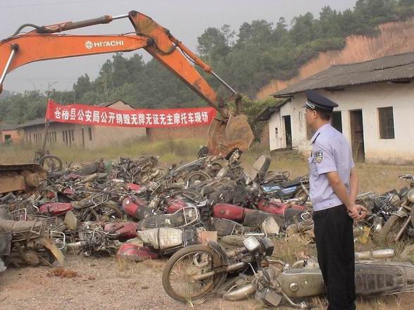 近年来,苍梧县公安局根据梧州市公安局部署及本辖区实际,多次开展统一治安清查行动,收缴了一大批无牌无证或挫改号码的摩托车,经侦查部门查证已经退回了一部份给事主,余下的部份有140辆经依法办理相关手续认定为无主摩托车。日前,苍梧县公安局党委经研究决定,于10月30日在县城龙圩西南大道边的一块空地上予以公开现场销毁。图为10月30日上午在交通民警的监督下,公开销毁无牌无证无主摩托车现场。