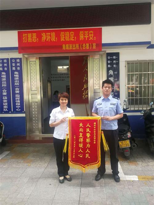5月2日,覃女士将一面“人民警察为人民、失而复得暖人心”的锦旗送至角嘴派出所以示感谢。