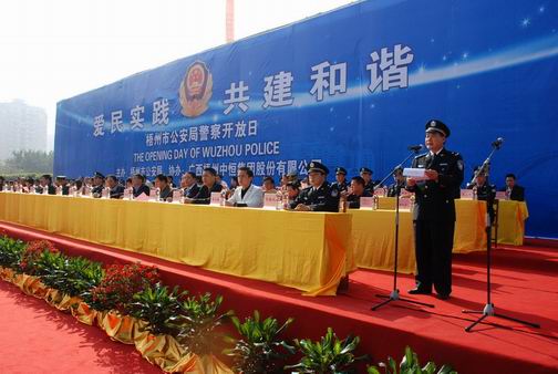 市委常委、市委政法委书记朱育兆也在活动仪式上发表了讲话,他指出,“警察开放日”是警民共享和谐的节日,是警民共建平安的盛会,同时也是党委、政府和广大人民群众检阅公安工作的一个很好机会。市公安局举办“警察开放日”活动,必将有利于向社会展示民警队伍的精神风貌和亲民、爱民、为民的良好形象,建立起平等、互动、互信的新型警民关系;必将有利于调动广大群众参与维护社会治安的积极性和责任感,推动公安工作不断向前发展。最后,朱书记对全市公安机关和广大民警提出了两点希望:一是要以警察开放日作为公安机关亲民大行动、情感大交流、实力大展示、素质大训练的有效载体,真正树立起公安机关和人民警察的亲民爱民形象,扎实推进公安工作和队伍建设再上新台阶;二是要大力发扬顽强拼搏、连续作战的优良作风,切实维护好梧州的社会政治稳定和治安安定,为建设富裕、文明、和谐新梧州做出新的更大的贡献。