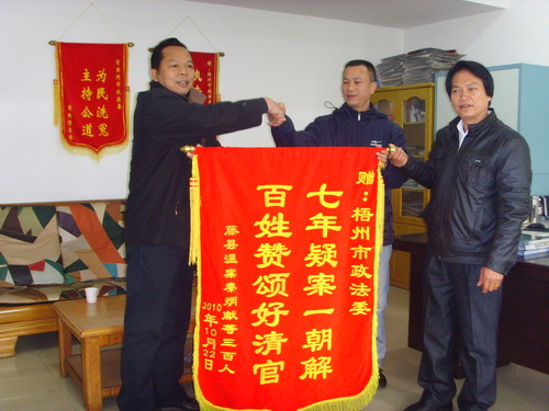 近日,藤县秦炳献等代表300多名当事人把一面写着“七年疑案一朝解百姓赞颂好清官”鲜红锦旗送到梧州市委政法委副书记罗本有手中,感谢在市政法委领导及有关部门的协调下,妥善处理了温某升合同诈骗案件7年遗留问题。