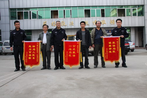 受害者家属及覃姓村民听到公安机关将4名命案主犯全部缉拿归案的消息,他们感到十分高兴,同时也十分钦佩我局民警“情为人民系,恶为百姓除”的崇高精神境界,他们便自发制作锦旗送给藤县政法公安机关,以表达他们的感激和崇敬之情。
