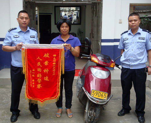 6月23日,苍梧县龙圩镇黎女士来到该县公安局城南派出所,将一面写着“破案神速 人民的好警察”字样的锦旗交到该所民警的手上,感谢民警为其追回其被盗的一辆摩托车。