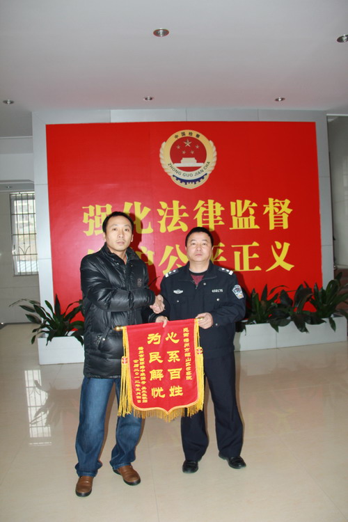元月4日新年上班第一天,家住本市西环路中段的吴先生专程赶到蝶山区检察院,将一面题有“心系百姓,为民解忧”的锦旗交到了该院法警大队罗强大队长的手中,由衷地感谢道:“十分感谢蝶山区检察院的检察官拾金不昧、不图回报崇高的道德情操和精神风貌,向心系百姓,为民解忧的好检察官们道一声‘谢谢’……”。