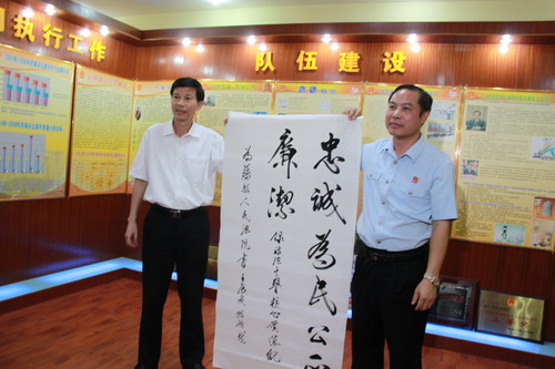 在藤县法院文化室,罗殿龙院长挥笔提写了“忠诚、为民、公正、廉洁”的条幅,鼓励该院全体干警以政法干警核心价值观学习为契机,创先争优提升司法能力,能动司法促进藤县跨越发展。