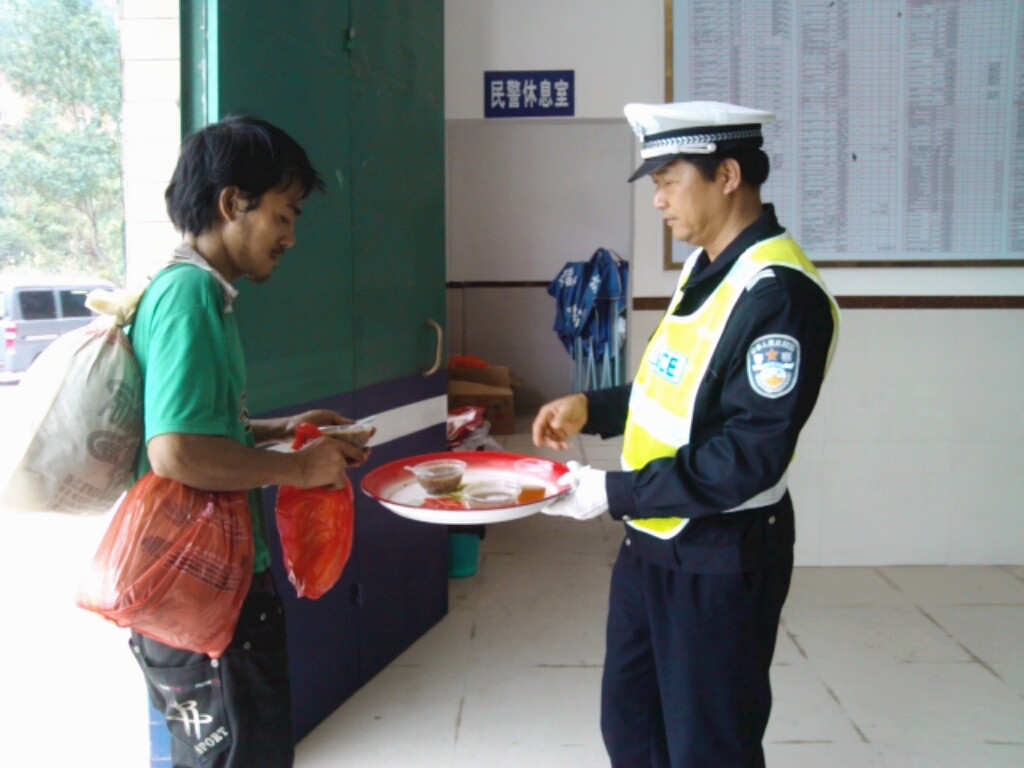 正是小年夜当天,岑溪交警大队办公室执勤小组在春运服务站执勤时,遇到一名类似流浪汉的男子上前问路。经了解,该名男子本来打算从广东坐车回灵山老家过年,但转车途中钱包都被偷了,家里穷,又没电话,无法联系他们,男子归家心切,所以决定一路走回去,目前已经走了三天了。执勤民警了解清楚后,劝说其留在服务站休息,并送上八宝粥和姜茶,让他补充体力。男子接过食物后,一直不停地向民警道谢。男子告诉民警,自己走了三天,途中受到许多人的帮助,特别是警察同志,他相信自己一定能顺利到家。正巧有灵山的客车经过服务站,在执勤民警的解释下,司机愿意搭乘该名男子回灵山。男子热泪盈眶,激动地握着民警的手道谢告别。所有执勤人员心里都有无限感慨,希望他回家的路能短点、再短点,让他能够早日回家团聚。