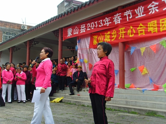 “新年初一喜盈来,大家高兴唱歌来;冇用琴来冇使笛,山歌唱得你开心。”当天上午9时30分,记者在刚进公园门口就听到歌圩开唱了。“蒙山县2013年春节业余演出——城乡开心合唱团”的横幅特别醒目,几百平方米的空旷歌圩人头涌动,人声鼎沸。