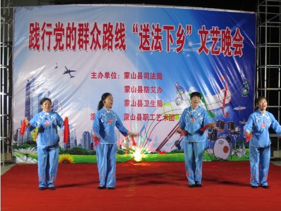 为深入开展党的群众路线教育活动,近日,由蒙山县司法局牵头与卫生局、县防艾办,联合举办了践行党的群众路线教育“送法下乡”文艺演出晚会,蒙山县职工艺术团为演出单位,分别在蒙山县水秀村、甘棠村举行了演出。晚会以歌曲、小品、相声、舞蹈、器乐独奏等多种艺术形式,宣传了党的十八大精神与群众生产生活密切相关的法律知识,以及艾滋病防治的常识,晚会既丰富了群众的文化生活又使群众在娱乐中潜移默化地受到了法制教育。