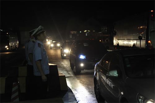 10月1日凌晨,梧州交警支队支队长唐剑锋、副支队长何家森亲临桂东收费站一线指挥调控过往车辆,