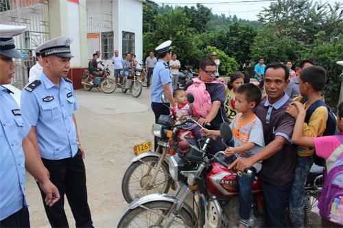 当天下午,大坡交警中队的民警会同县团委的领导来到苍梧县大坡镇初级中学与学校领导就学生在上下学时段如何做好交通安全,确保学生安全出行事宜进行了探讨,经共同协商决定每逢学校放学时段,由大坡交警中队派出警力与学校老师一起联合执勤共同维护学校周边的交通秩序,设立“交通安全联合执勤点”,县团委加强督促和指导。当天下午放学时分,大坡交警中队的民警和县团委领导来到学校门口共同维护交通秩序,并及时纠正了部分学生家长驾驶两轮摩托车正在接学生放学严重超员、不戴安全头盔的交通违法行为,并对家长和学生宣传交通安全常识,劝导他们要“拒绝乘坐安全隐患车辆”,驾驶和乘坐两轮摩托车要戴安全头盔,严禁超员等等,同时要求学生在国庆节放假期间要自觉遵守交通规则,过一个平安的国庆佳节。