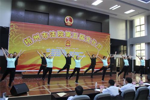 在当日举行的梧州市法院第五届文化周体操比赛中,随着强有力的“一二一”号令声,齐步前进、精神抖擞的藤县法院代表队一上场就博得在场观众阵阵掌声。该队十二名队员面带微笑、自信满满,在音乐伴奏中,动作划一、伸展自若,每位队员的每个举动都那么有节拍,那么优美。赛场中名,在这十二名队员的演绎下,音律之美与动作之美瞬间融为一体,向观众传递着信心与力量,传递着赏心悦目的美感。在比赛尾声,该代表队又踏着强有力的“一二一”号令声,从容走下台,再次博得全场欢呼声和掌声。经评委打分,藤县法院代表队最终以96.2的比分,毫无悬念地问鼎冠军。