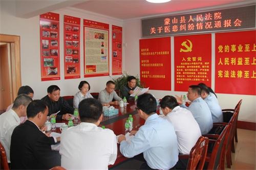 11月4日下午,蒙山县法院向卫生部门通报医患纠纷情况,并与卫生部门有关负责同志座谈交流,共同探讨医患纠纷解决机制。副县长刘念、蒙山县法院院长张勇参加了通报会。
