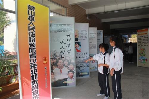 当天上午,湄江中学的1500多名师生观看了“蒙山县人民法院预防青少年犯罪教育宣传展”,拉开了巡回展出的序幕。