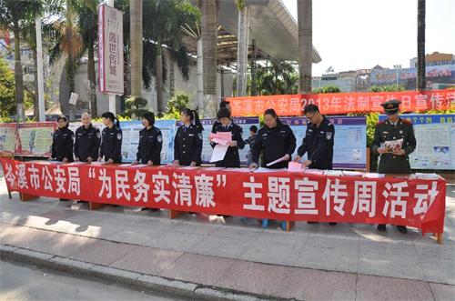 为贯彻“为民务实清廉”主题实践活动的要求,进一步密切联系和服务群众,11月30日上午,岑溪市公安局法制、宣传、治安、刑侦、经侦、消防等部门民警,在岑溪市人民广场开展了“为民务实清廉”主题宣传活动。