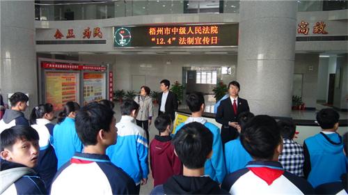 12月4日是全国法制宣传日。当天上午,梧州市中级人民法院举办 “法院开放日”活动,邀请梧州市第五中学70名学生代表到法院参观交流。活动中,同学们参观了立案信访大厅、科技法庭、法院文化教育基地等,观看了“未成年人犯罪警示录”等宣传视频,“零距离”地接触了法官和审判庭,法官们还向同学们分发了远离犯罪警言卡片,向同学们介绍了法院建设情况以及与青少年相关的法律知识,使青少年学生对国家的法制发展历史、我市法院审判执行工作及队伍建设等情况进行了全方位了解,增强了法院工作的透明与公开,更让青少年学生切身感受到法院管理的规范化及法院干警爱岗敬业的良好风貌,树立起崇尚法律的理念。